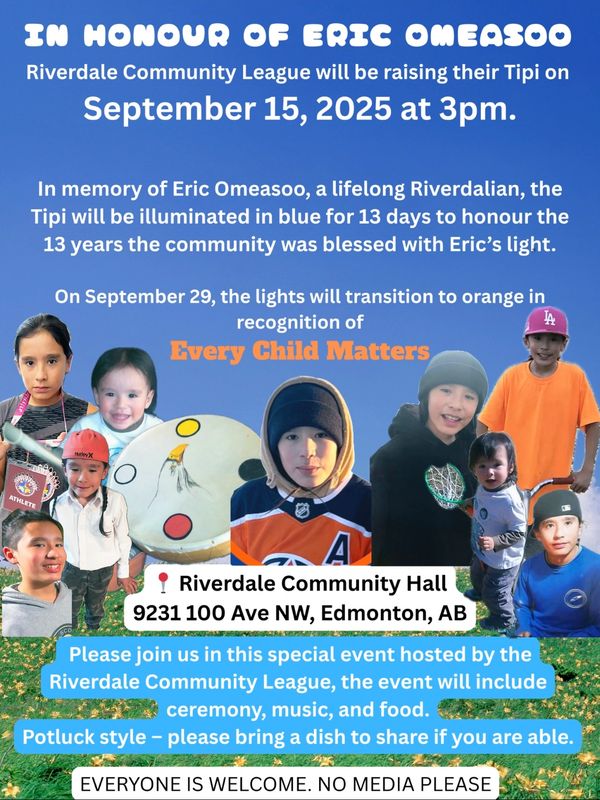 September 15, 2025 in memory of Eric Omeasoo, a lifelong Riverdalian. The Tipi was illuminated blue for 13 days to honour the 13 years the community was gifted with Eric's love and light.